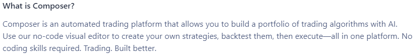 Simple enough, it’s a timeframe thing. Composer allows daily strategies, so it falls under most definitions of “Trading.” From a strategy building perspective however, I believe they’d be much better served calling themselves an Algorithmic Investment platform.