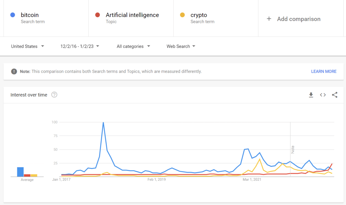 A quick look at Google Trends shows a very large uptick in searches for "Artificial Intelligence". It hasn't reached the popularity of "bitcoin" yet but it is almost up to par with 2021's search for "Crypto"
