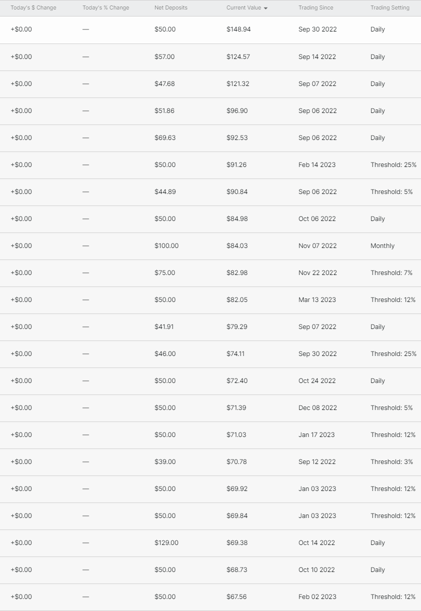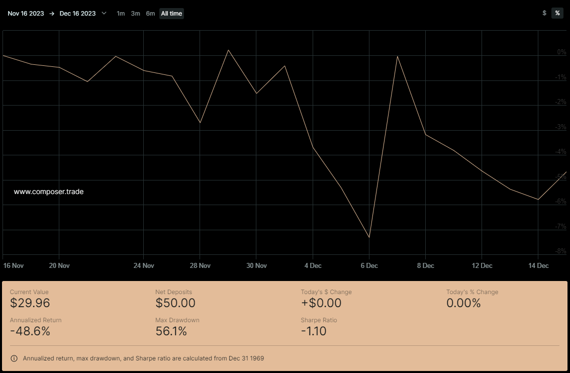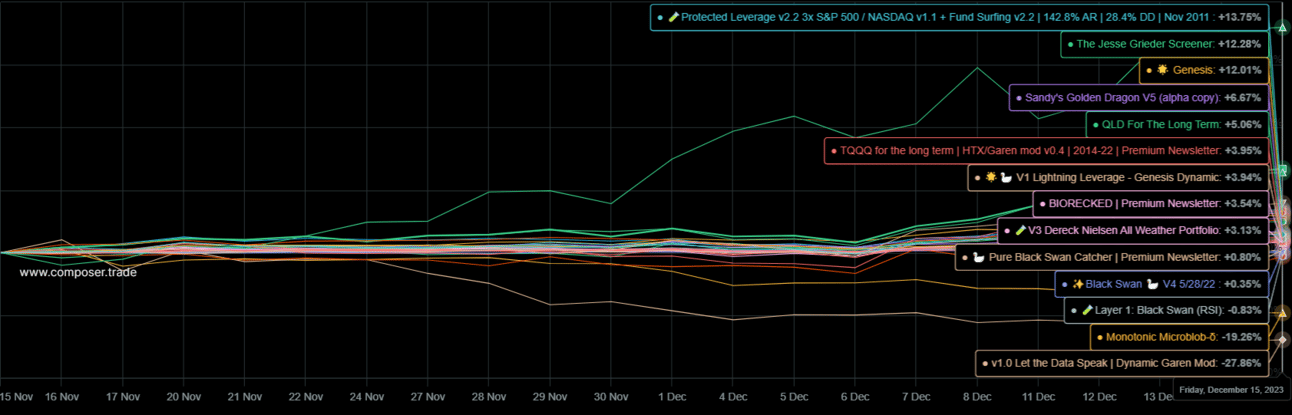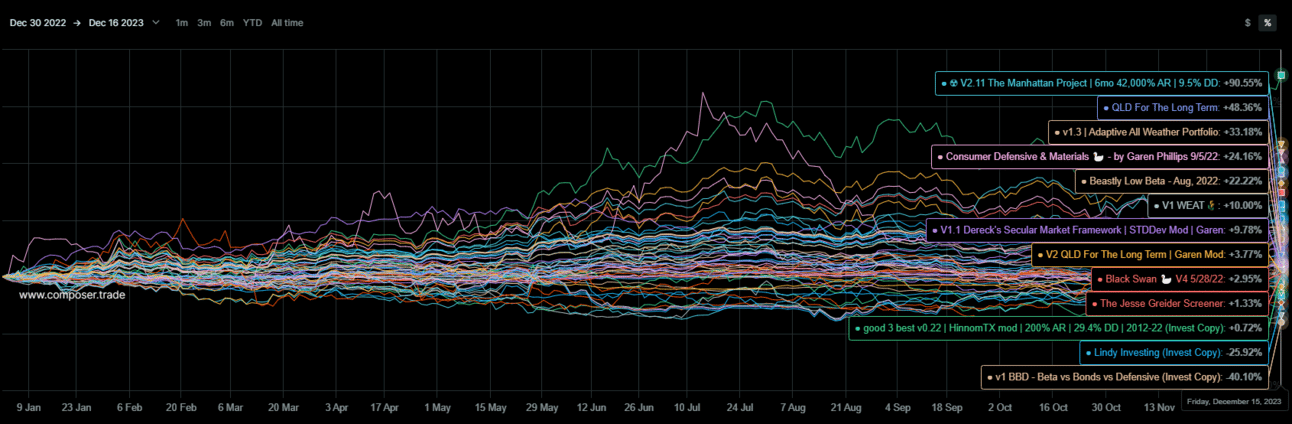We’ve got a grand total of 95 strategies currently in the tracking pool, with data going as far back as 08/09/2022 and starts as recent as mid October 2023. Now, there have been changes in when Composer executes orders in that time, so there are limits to the absolute accuracy a lot of older data. However, I believe that some data, even if imperfect, is better than total mystery.
