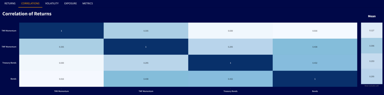 This is possibly my favorite image in this entire article. The volatility blocks have almost no correlation to each other when they’re collectively in a state of drawdown. In many ways, this block acts as the black swan catcher of the entire strategy, just as Mutiny Funds and Artemis describe the volatility trade, with inspiration from . It is a hedge against any rapid and unexpected shifts in the market, as any good volatility trade should be.