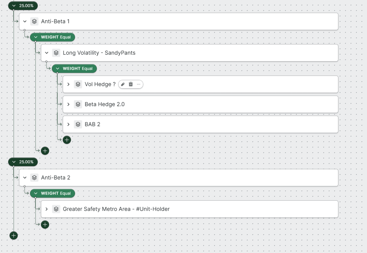 This is the side I can’t take credit for, this is the work of two brilliant community members crammed into one symphony. Utilizing the Long Volatility section from one of Sandypants#7720’s Dragon Variants and the collection of Safety Town symphonies released by Unit Holder over on Discord, we’ve successfully allocated roughly half the symphony to strategies that largely ignore the market. If you aren’t a fan of Bonds and Volatility based assets, this part of the strategy is not for you.