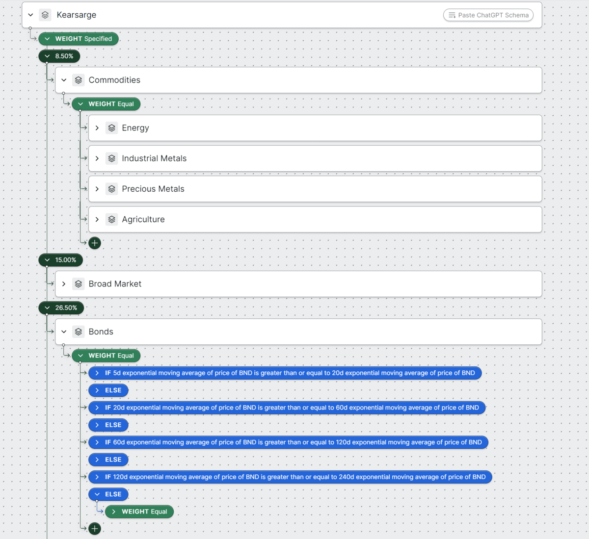 Very, very easy to grasp despite being visually large. The first 3 sections are weighted to a total of 50% of the symphony, and are broken down in to sectors and industries. In each sector and industry, there is a check to see if a shorter-length Exponential Moving Average is over a longer one, signaling a potential bullish market environment for that asset class over that timeframe. Beneath each of those checks is a dip-buying check filled with relevant high-volume tickers, using leverage whenever possible. The lowest Cumulative Return ETF (I specifically avoided ETN’s due to the risk of, you know, companies blowing up) is bought out of that group. When outside of a bullish context, some kind of index fund or similar is allocated to.